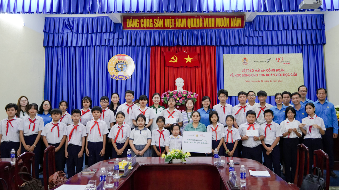 KCN Vietnam’s representative presents housing construction and renovation support to union members, along with scholarships for high-achieving students from disadvantaged worker families in Dong Nai Province.